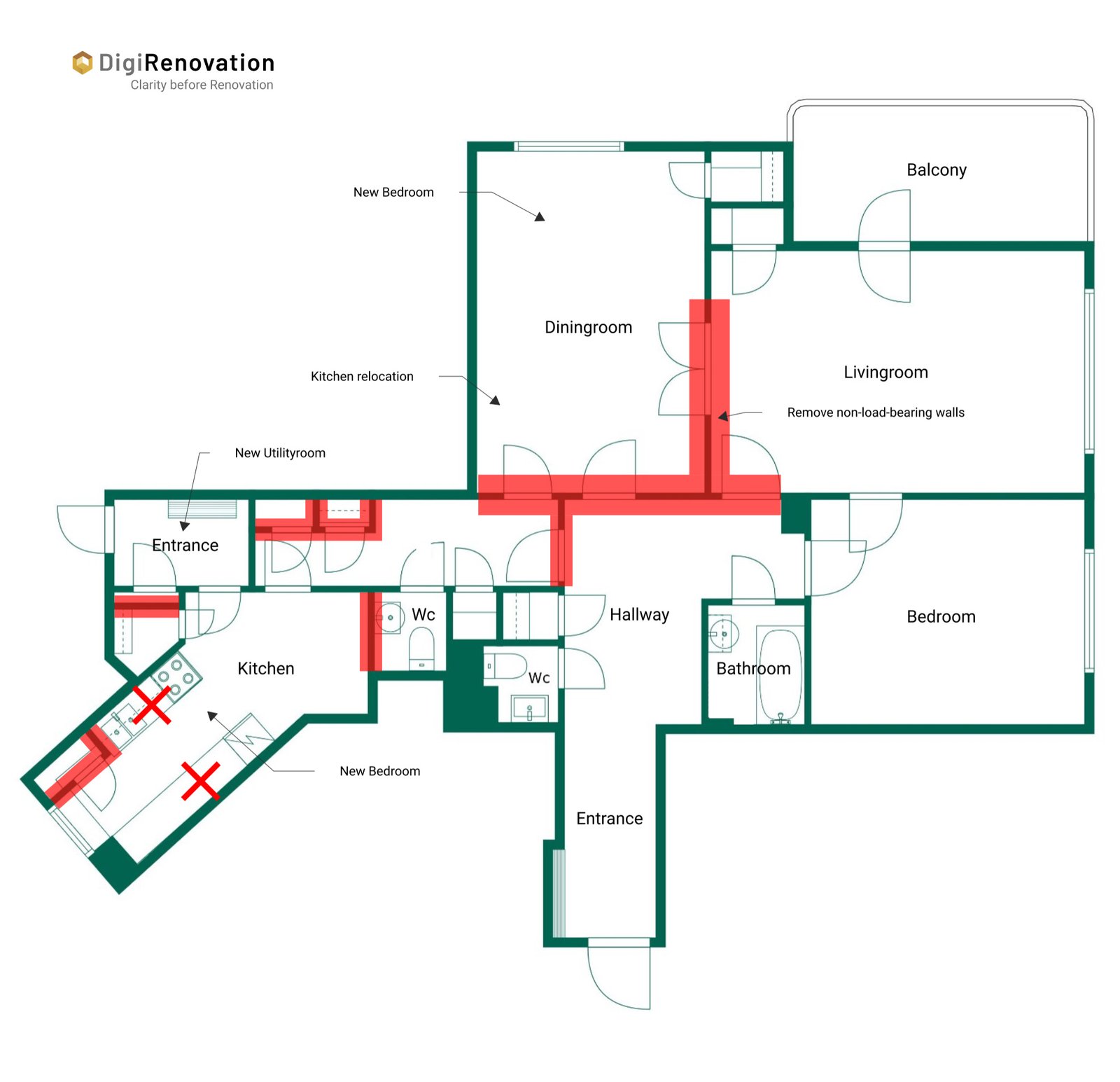 “The reviewed layout has significant potential for big improvements. There is a good opportunity to open up the living area, get an open kitchen and accommodate 3 bedrooms, all in different ends of the apartment. We also see potential to enlarge the second WC to a bathroom. By closing the second entrance to the apartment there is the option to build a separate utility room. All removable walls are non-load-bearing. Suggested changes will increase light, flow and decrease the amount of impractical corridors.”